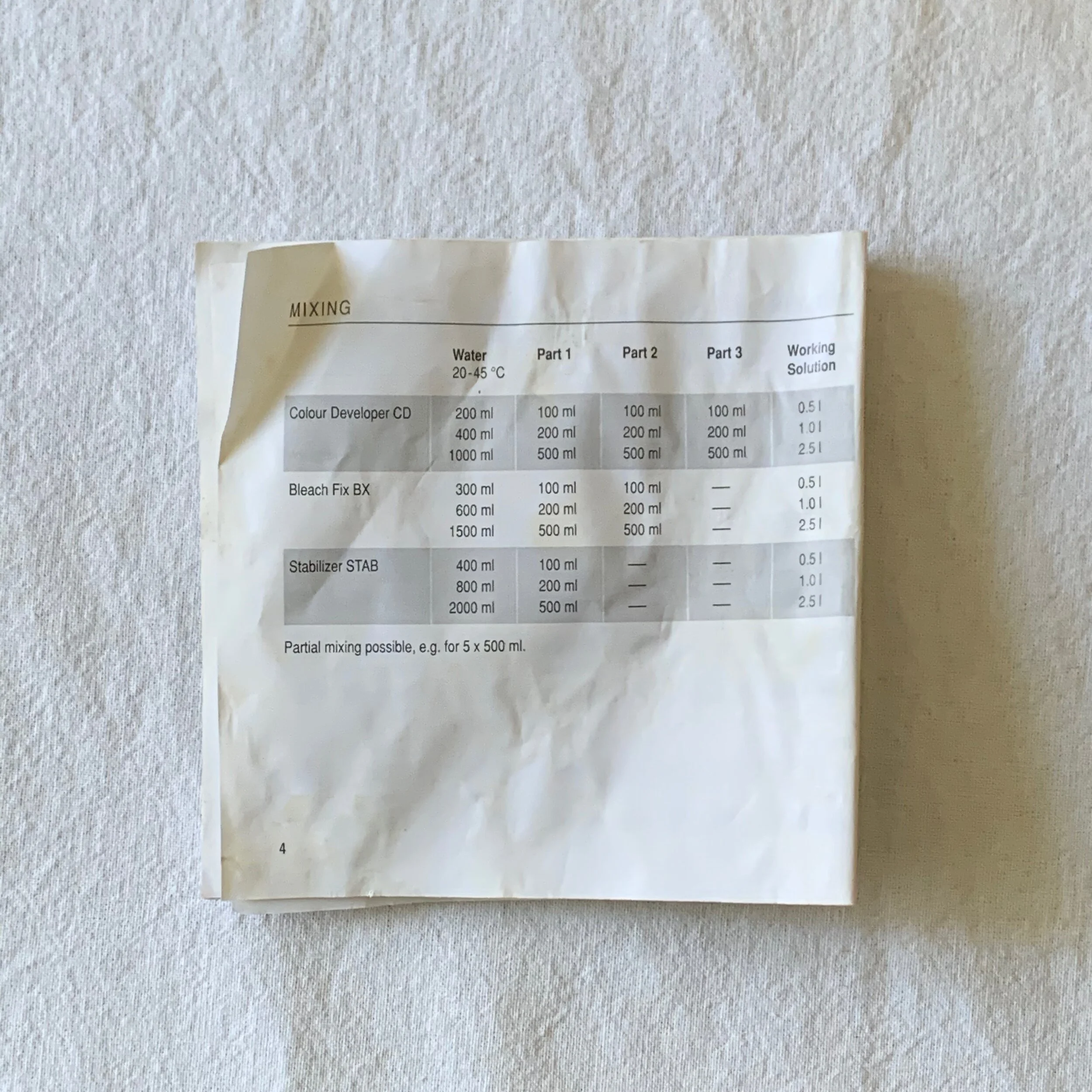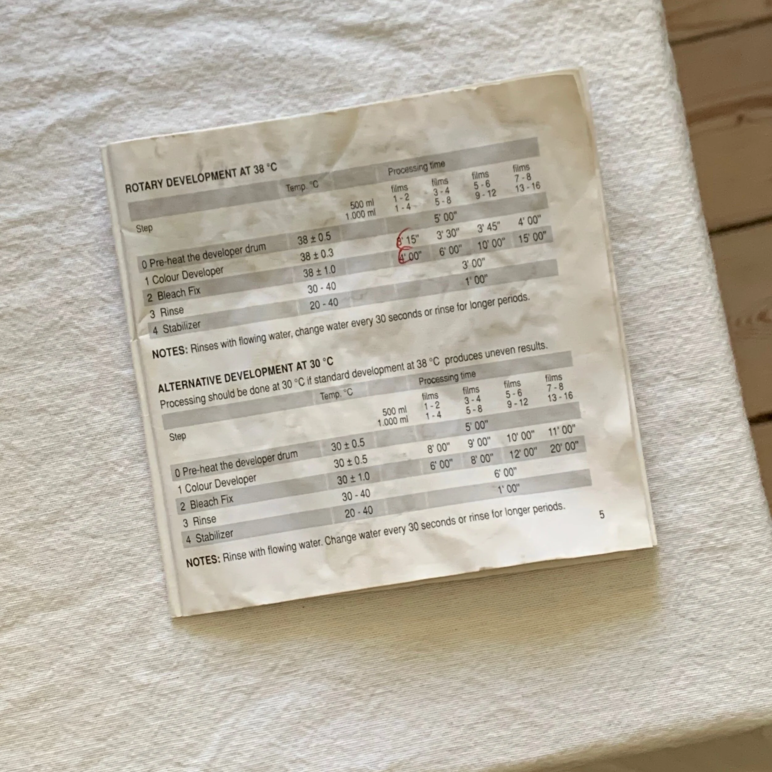 Som du kan se, har jeg også markeret, hvor længe filmen skal være sammen med væsken, med 1-2 film i tanken. Det har jeg ikke været super succesfuld i, og jeg er vist kommet til at overstrege mere end at fremhæve. Men fremkaldervæsken skal være sammen med filmen i tanken i 3 min. og 15 sek. Bleach fix i 4 min.