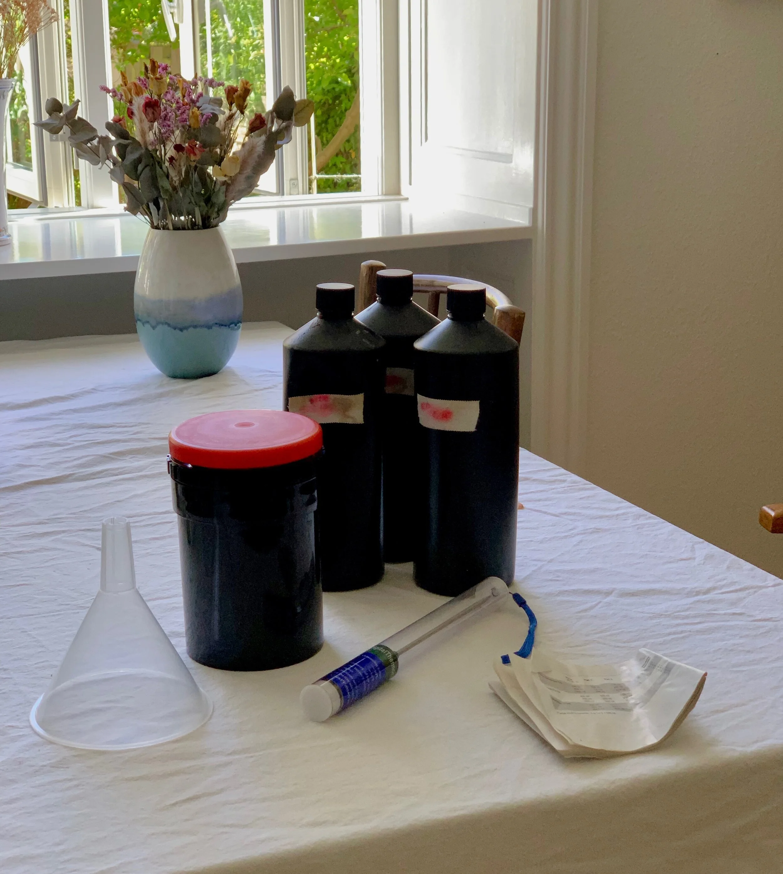 Det er desværre ikke muligt at fremkalde dine billeder uden først at skaffe noget grej til det. Som du kan se på billedet ovenfor, er der lidt forskelligt, som du skal have fat i først. Jeg har udeladt at fotografere min vaskebalje, som jeg også bruger – mere om det senere.